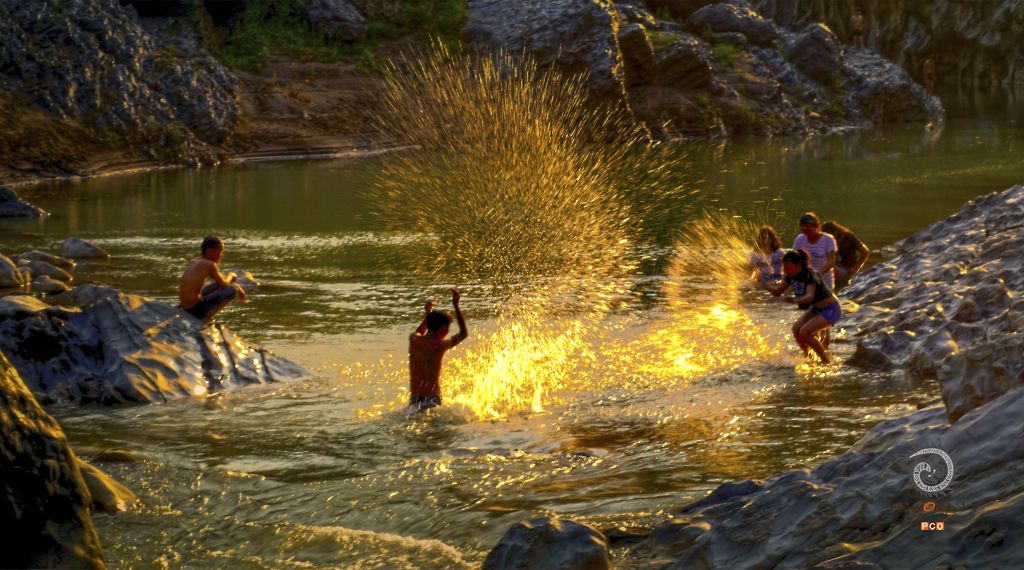 清水河位于水城县都格乡,世界笫一高桥---北盘江大桥从上跨越.图为夏日少年们在河中嬉戏