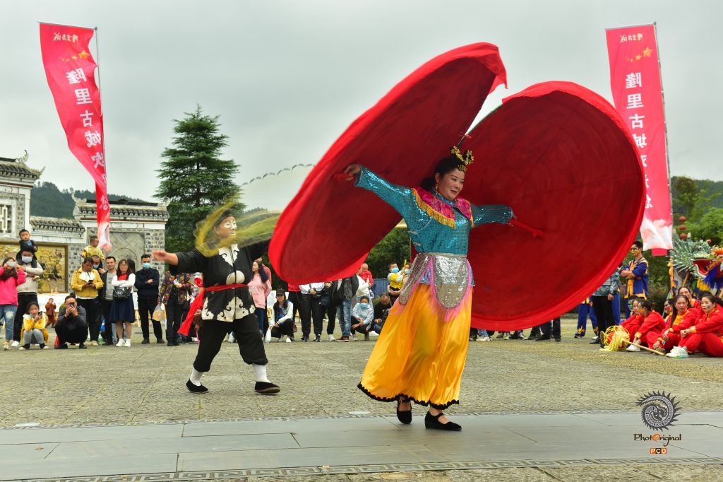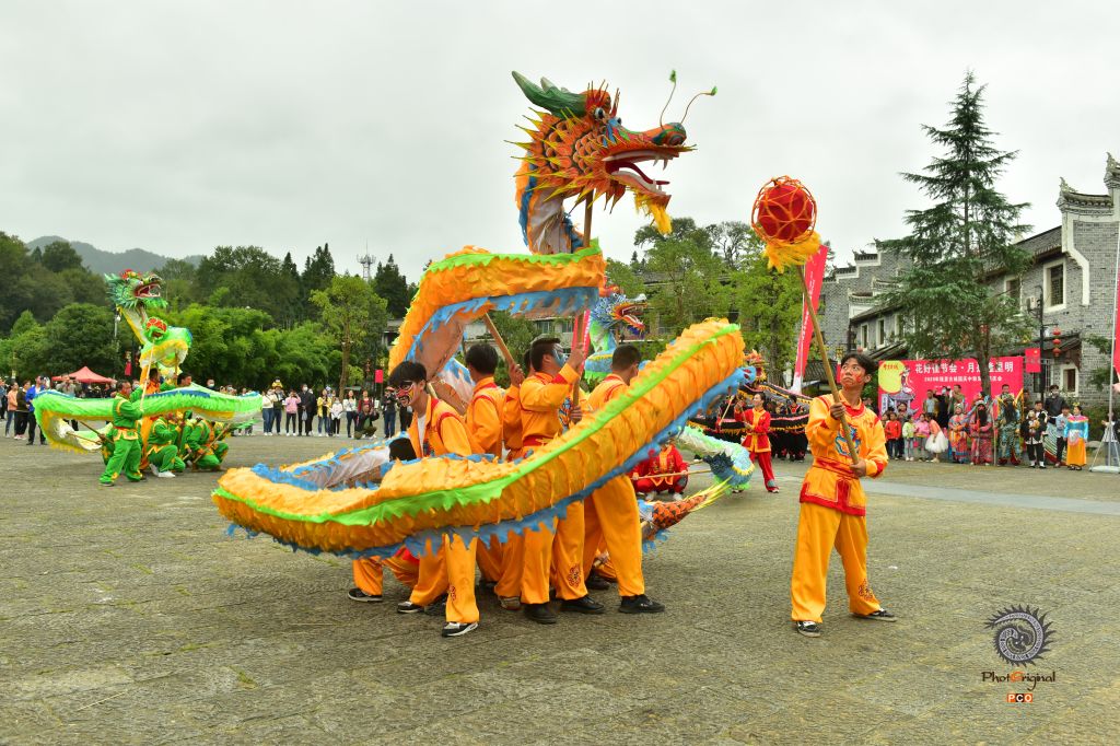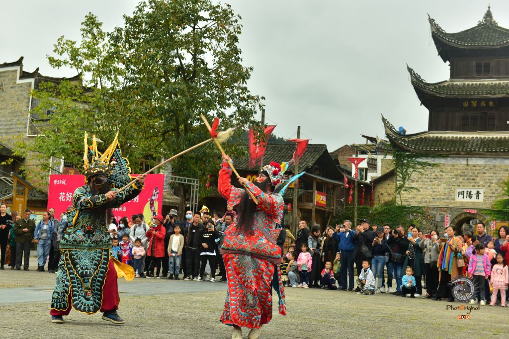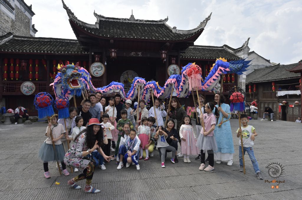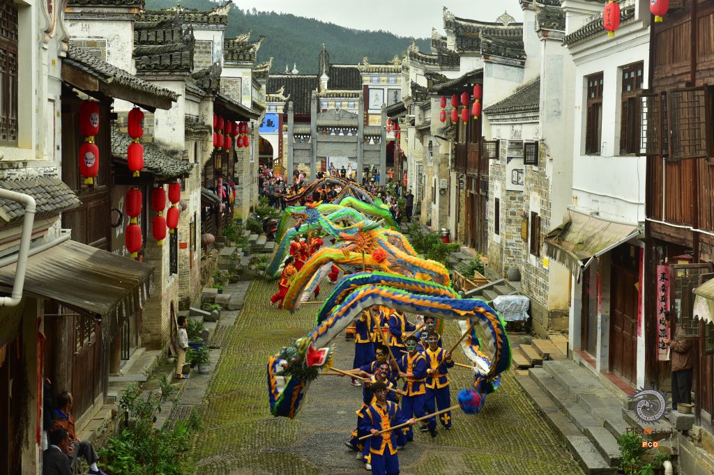 2020年10月4日,贵州省黔东南州锦屏县隆里古城的舞龙表演队在游街表演“花脸龙”。 国庆长假期间,锦屏县古城隆里大街小巷激情似火,热闹非常,古城儿女欢欢喜喜,描绘脸谱、舞龙表演、汉戏表演,欢度国庆佳节,吸引省内游客到此观赏旅游。