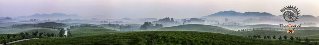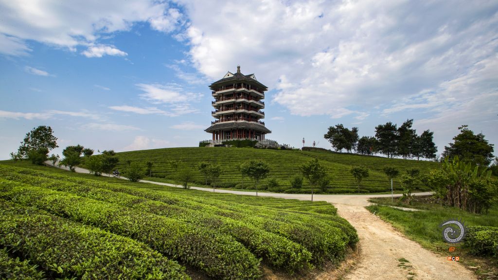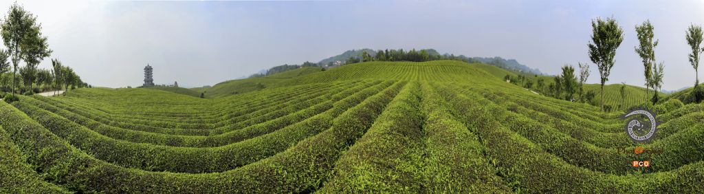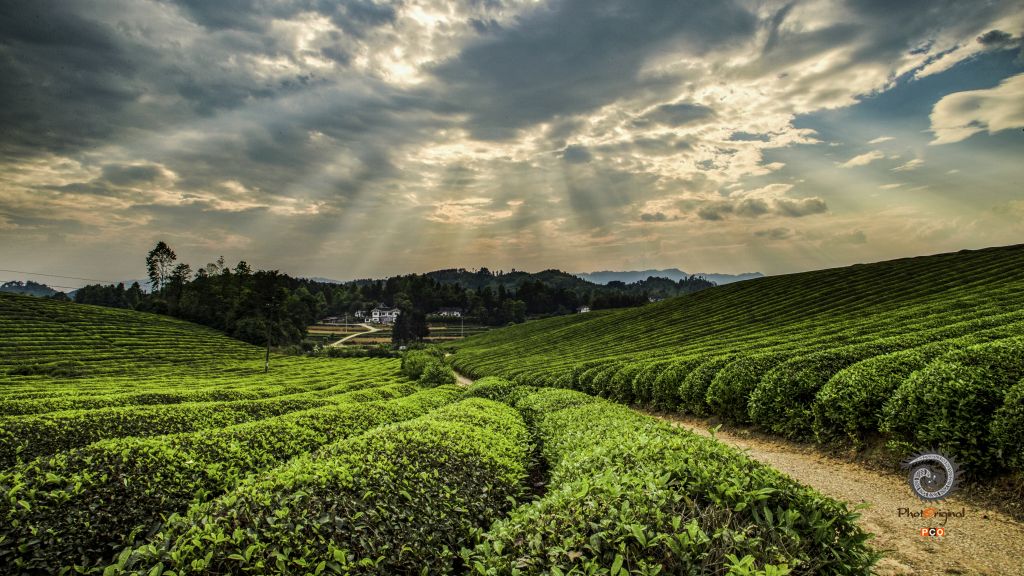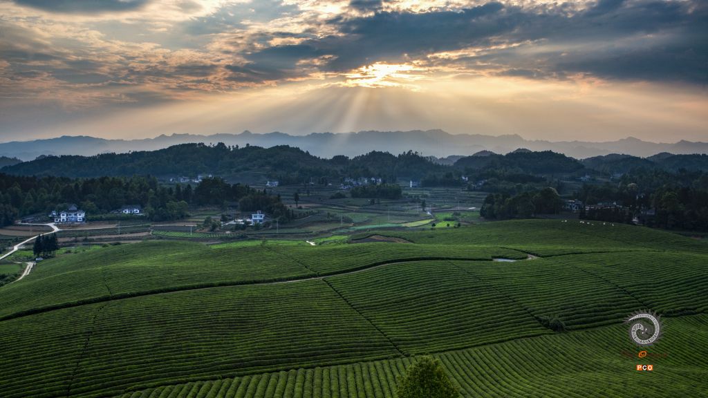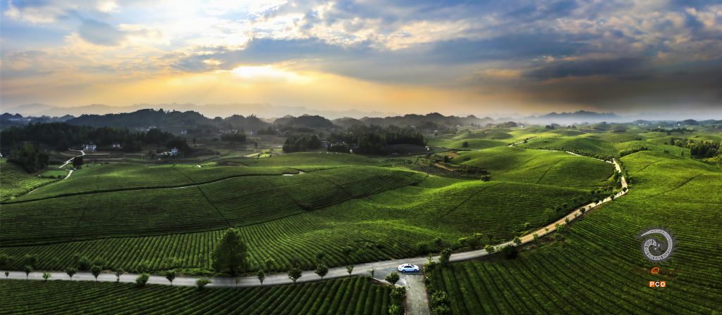 湄潭茶场 早晨;露珠晶莹星光灿,轻纱薄翼淡若烟; 黄昏:夕阳初照群山染,遍地翠芽嫩绿黄,
