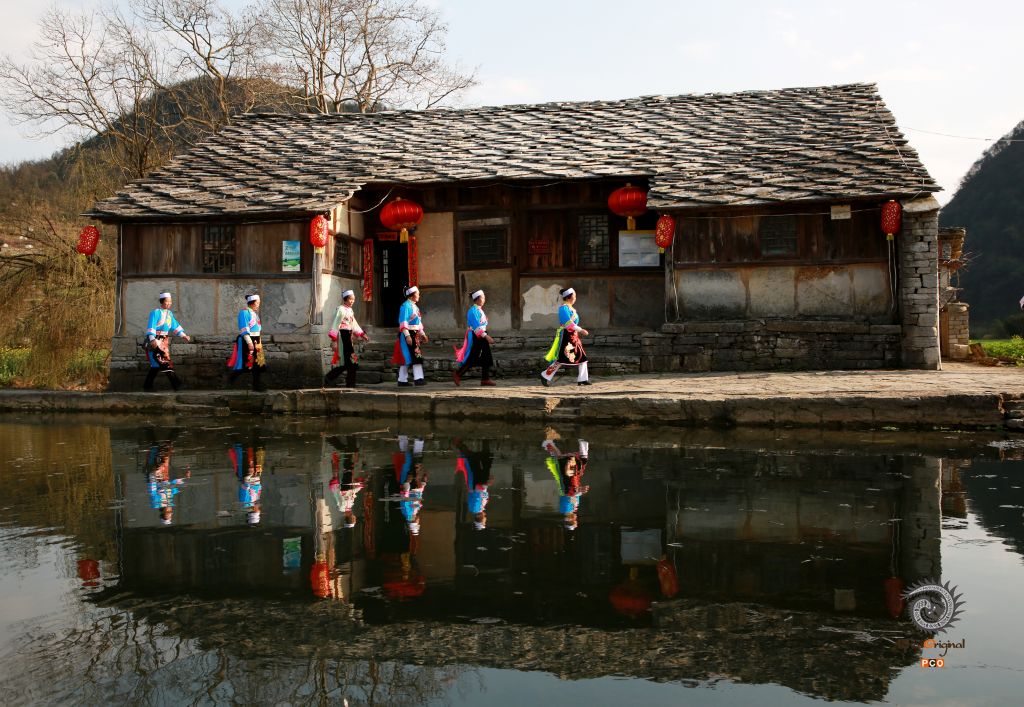 摄于2021年2月17日,地点:贵州省安顺市七眼桥镇鲍屯村。一队屯堡妇女身着她们本地特色服饰,走过一间明清时期,承载600多年历史的水磨房,水磨房就像一位久经风霜的老人,仿佛诉说着从前的故事,房前的小河静静的流淌,水磨房和人物的倒影在水面虚幻婆娑,相互映衬,形成一幅色彩斑斓,历史气息浓郁,又使人流连忘返的乡村美丽画卷。摄影:赵金芳,电话:18286356771