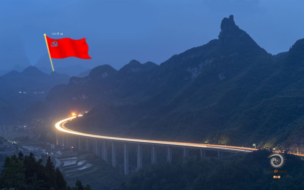 中国共产党诞辰100周年,遵义绥阳坪乐镇有一座山,形似大拇指,人称点赞山。夜幕下,蓝调时分,高速公路车轨蜿蜒,大拇指为中国共产党100年来取得的成绩,为祖国的繁荣昌盛点赞。
