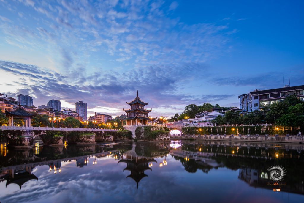 拍摄于2021年6月7日,太阳刚刚冒出地平面时,甲秀楼格外美丽。