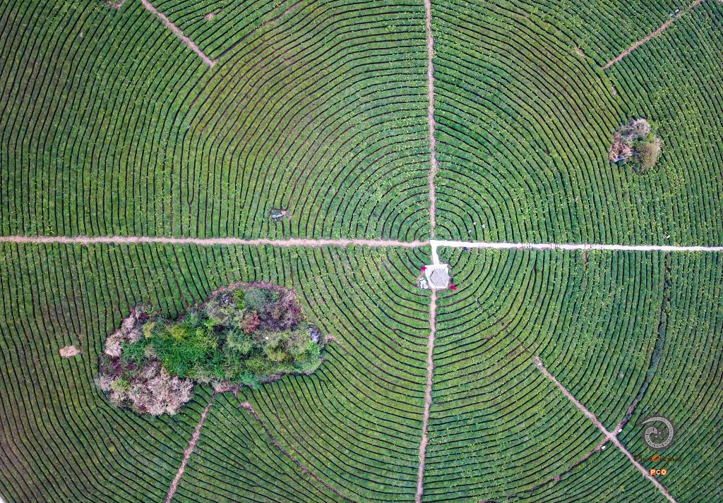 2018年3月21日,茶农在贵州省安顺市西秀区鸡场乡鑫堡村一茶园采摘春茶(无人机拍摄)。目前,贵州安顺黄果树毛峰、朵贝茶已获得国家地理标志产品保护,安顺瀑布茶获颁中国农产品区域公用品牌,茶产业已成为当地农民增收的重要渠道。