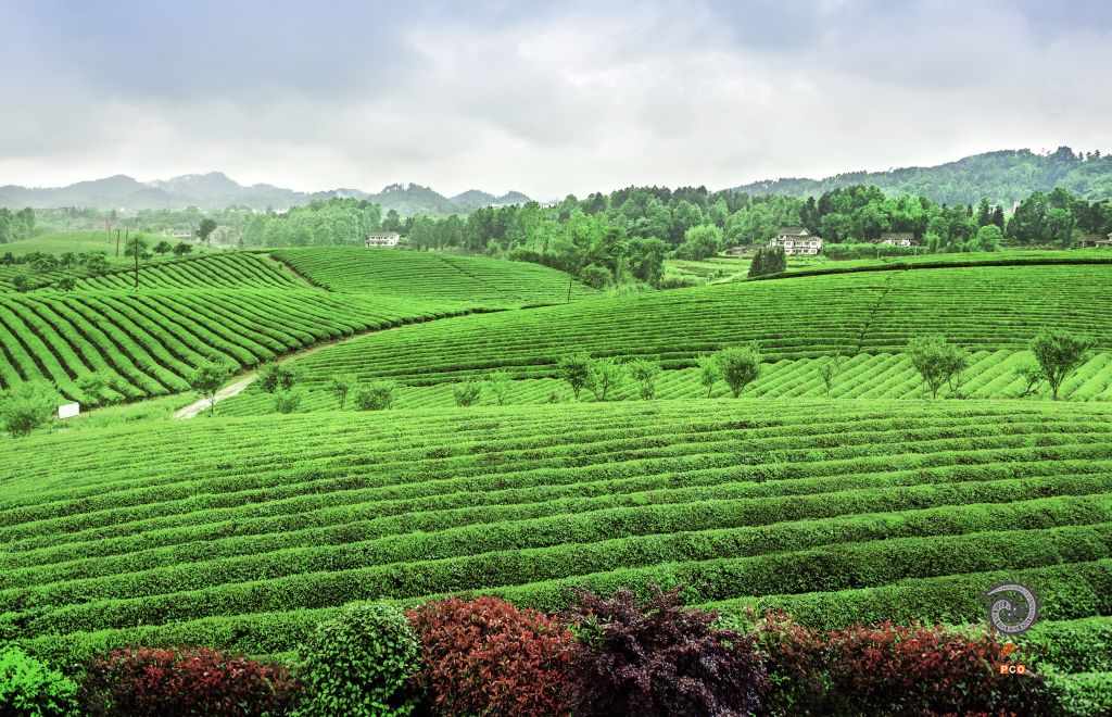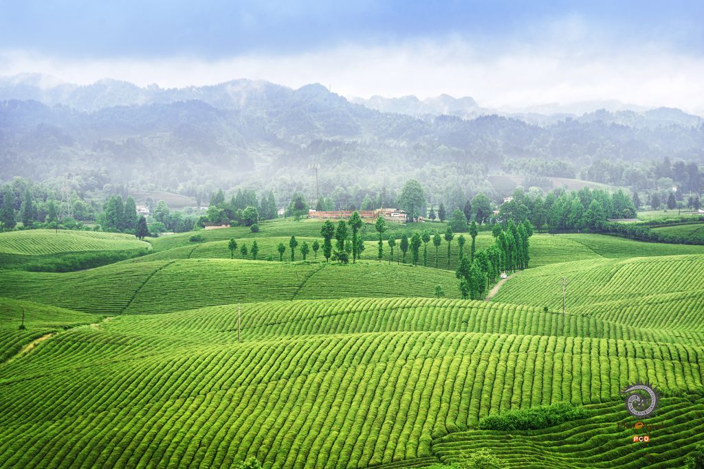 摄于2021年5月22,全国较大的茶场,茶海远处的人家给人一田园幽静的景象,让人向往。