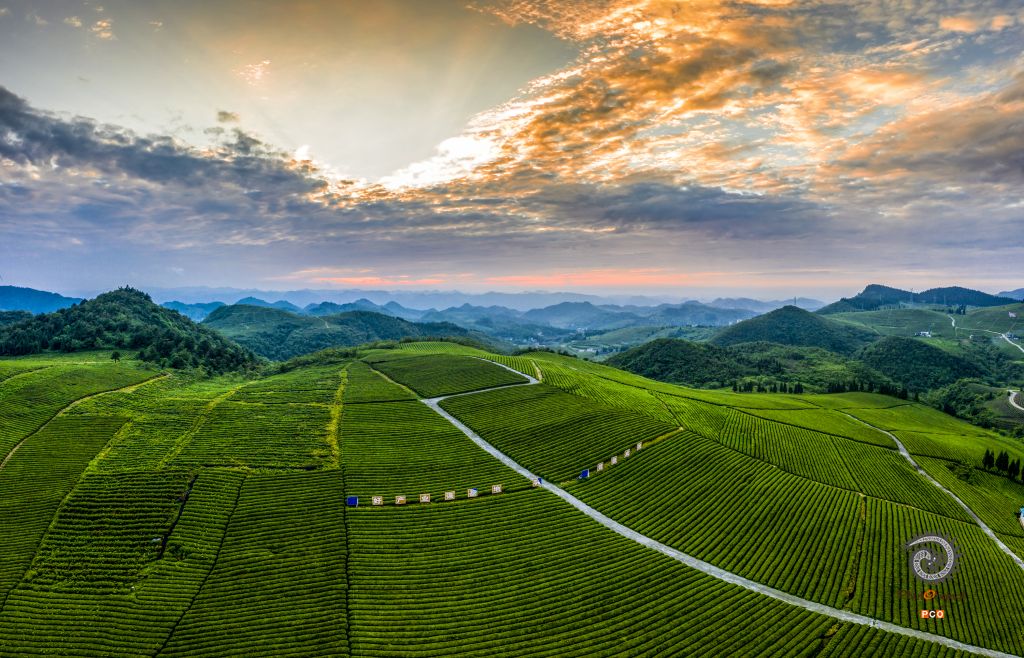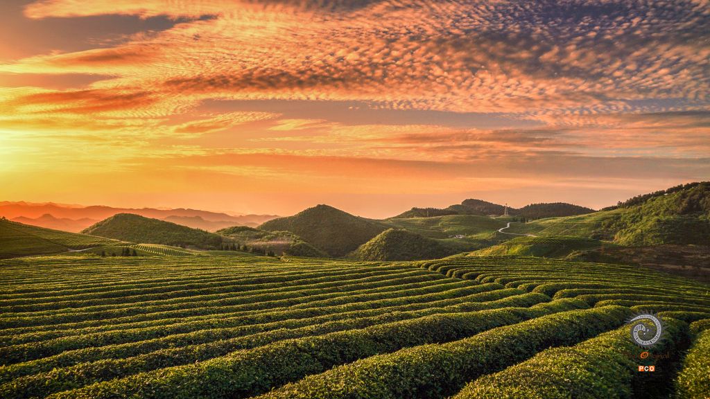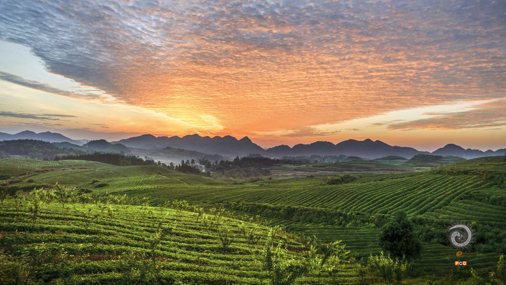 《朝霞映照茶园》