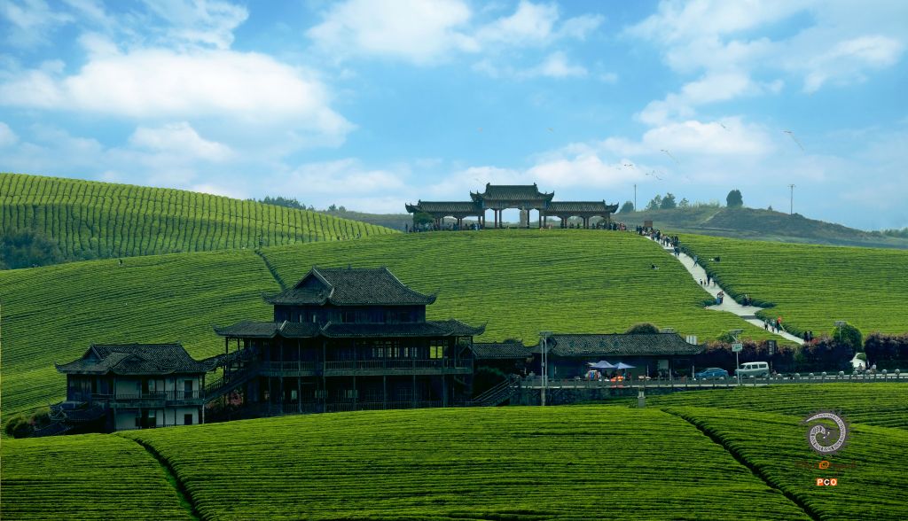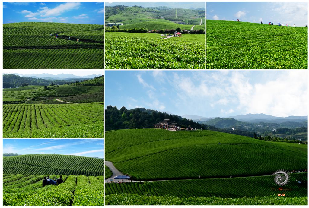 松桃苗王城茶园,正值新芽成熟季节。大图是游人在茶园内玩耍,采茶师傅们在采新茶;上图左是游客在茶园游玩;上中小商贩在茶园内摆摊售卖;上右是游客们在茶园玩耍;中左是茶园一派生机勃勃;下左是采茶师傅们正在采茶。
