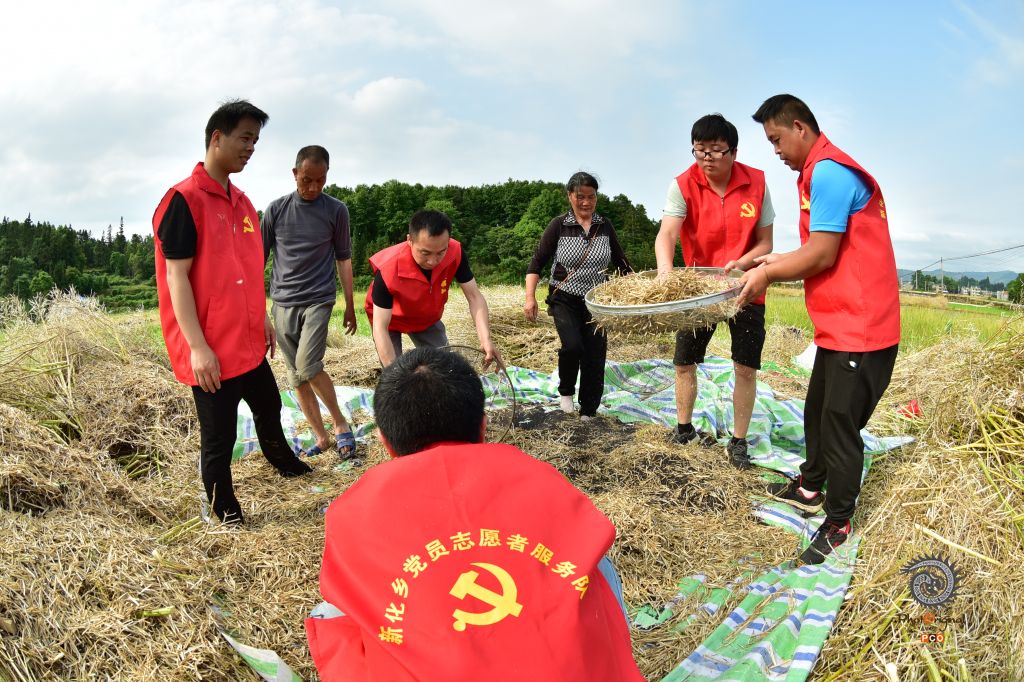 2021年5月11日,贵州省黔东南州锦屏县新化乡机关党员志愿者服务队在帮助缺少劳动力的农户采收油菜。 初夏时节,正是油菜成熟采收的繁忙季节,为确保油菜籽颗粒归仓,锦屏县组织若干支党员志愿者服务队,深入田间地头帮助缺少劳力的农户抢收油菜。