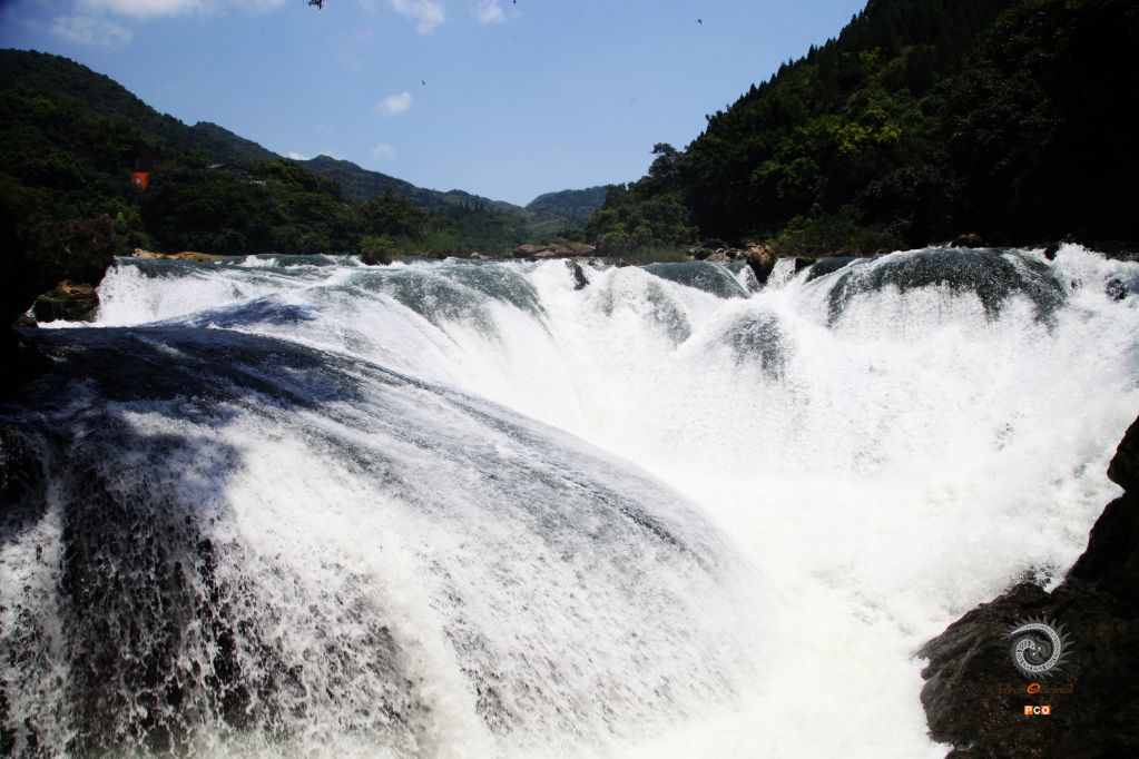 黄果树银链坠潭瀑布,水质清澈,水流量大,白云蓝天,燕子飞舞,十分壮观。
