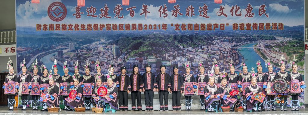 《锦屏苗绣》拍摄于2021年6月5日,地点:锦屏县三江镇。在非遗宣传日活动舞台上,来自偶里乡的苗族同胞在现场展示绚丽多彩的苗绣服饰。