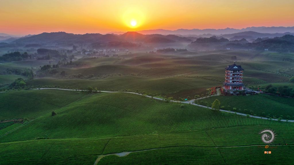 拍摄于2021年5月15日,中国西部茶海景区位于湄潭县永兴镇,连片茶园有4万余亩,是目前我国最大的茶海景区,5月中旬的清晨,刚从地平线上升起的太阳映照在茶林中、茶树上,显得绿波荡漾