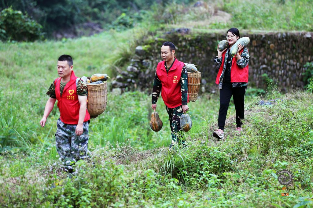 2020年9月25日,志愿者在贵州省锦屏县钟灵乡贡村村搬运收获的南瓜。