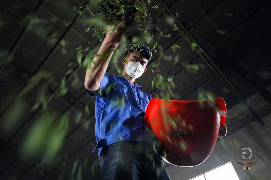 这是2019年4月9日在贵州省铜仁市玉屏侗族自治县亚鱼乡一家制茶企业加工厂内拍摄的制茶画面。