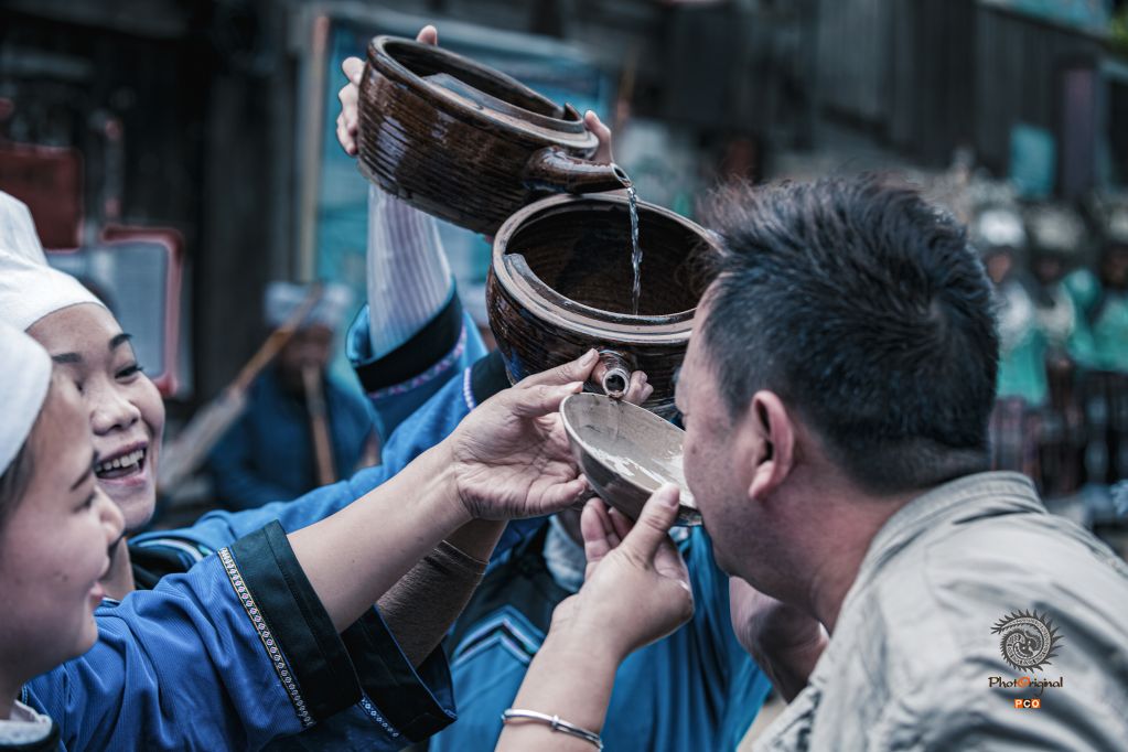 雷山县达地乡,每年都要举办传统的丰收节,图片记录了独特的拦门酒方式——高山流水。