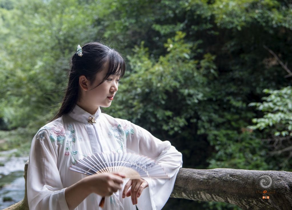 在中国历史文化名城镇远铁溪景区内,一美女穿着汉服在幽静而清凉的铁溪景区小道上,端详地注视着小溪里游荡的鱼儿。