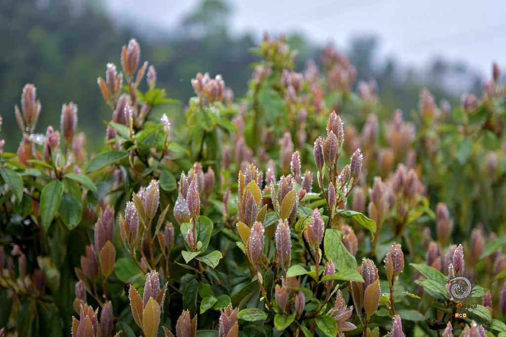 雨后白茶嫩芽,蓄满水珠,在幽静的环境中更显清香。