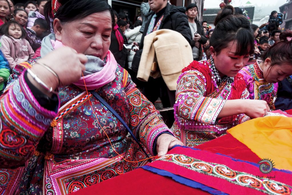 拍摄于2019.2.7.关岭花树节上参加节日的苗族妇女展示精彩的绣节