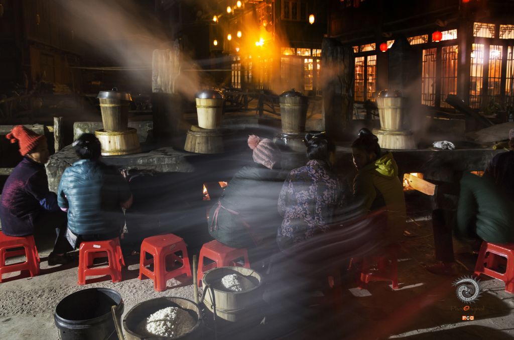 拍于2016年2月8日黎平县肇兴村,侗族妇女正在帮村民家办喜事蒸糯米饭。