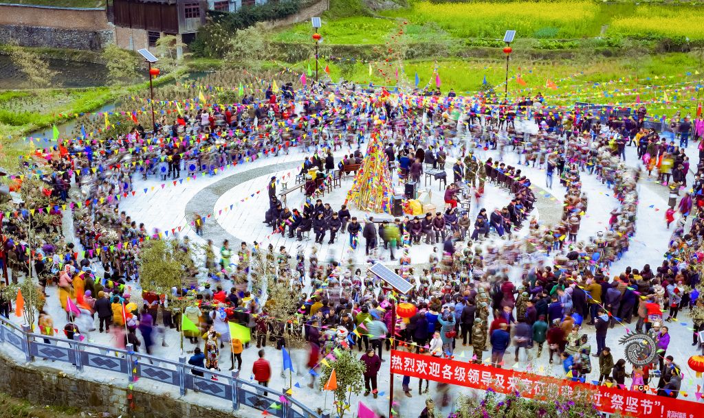 2017年春节期间,黎平尚重镇育洞村时逢七年一次的侗族“牯藏节”又称“祭坚节”,这是黎平县侗族地区最隆重的祭祖仪式。育洞村的侗家姑娘们纷纷穿上崭新的盛装,村里所有的小孩子也梳妆打扮好,在侗家琵琶的伴奏下,她们且行且唱,在侗家鼓楼前围成一个大大的同心圆,这就是侗族踩歌堂。