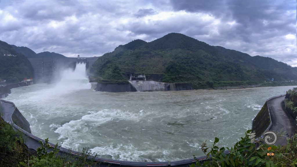 《清水江的三板溪电站》,拍摄于2020年7月11日,地点:锦屏县三板溪电站。该电站最大坝高185.5米,总装机容量100万千瓦,安装4台25万千瓦混流式水轮发电机组,年发电量24.28亿千瓦时,是国家西电东送“十五”重点工程,亚洲第二高水电大坝。图为大坝泄洪放水场面,水流直冲而下,气势磅礴。