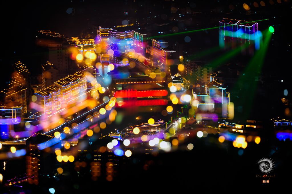 迷离的灯光,照耀着幽静的小城。多重曝光摄影。