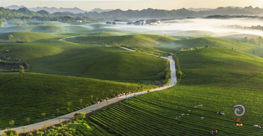 湄潭永兴茶海是中国较大的茶山,晨曦中,云雾里,采茶工人在辛勤采茶。一派欣欣向荣的景象。