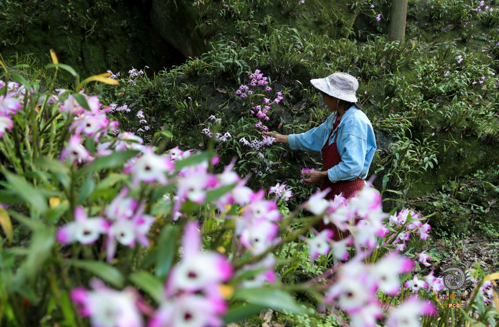 2021年5月9日,贵州省赤水市长沙镇长兴村的村民在采摘金钗石斛花。立夏之后,贵州省赤水市长沙镇种植的金钗石斛花进入盛花期,当地村民忙着收获采摘鲜花供应市场。作为一项扶贫产业,当地因地制宜在荒石堆上种植金钗石斛,产出的收购价高出同类。据了解,该镇的石斛种植面积1万余亩,产值达1亿多元。