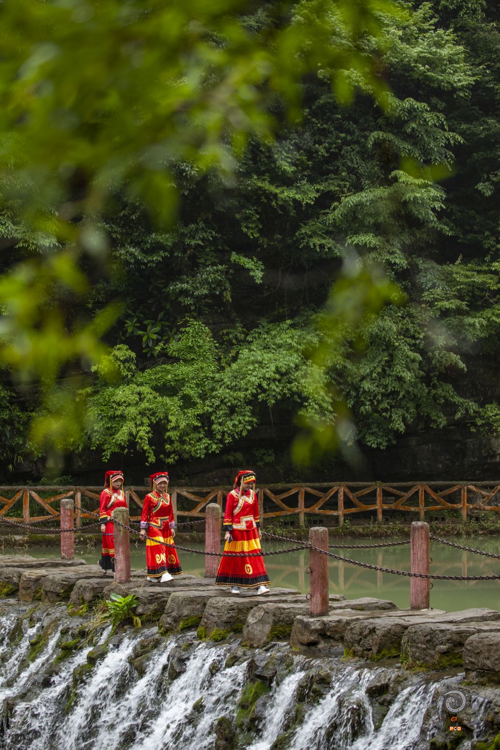 2021年5月22日,贵州省百里杜鹃米底河景区,三位彝族姑娘走过河水石墩, 说说笑笑,在青山绿水间格间和谐耀眼。