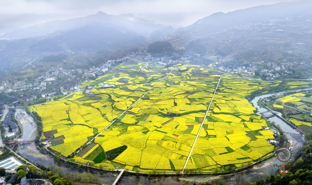 开阳县油菜花海田野,配小桥流水,得天独厚的圆形花海。