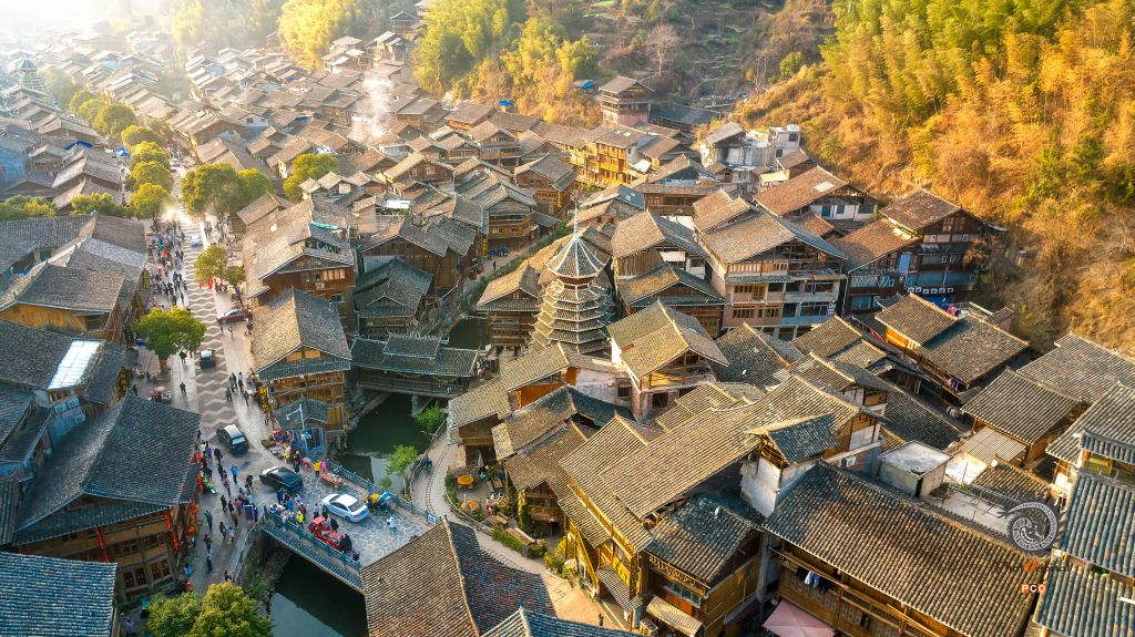 肇兴侗寨小桥上幸福繁忙的人们
