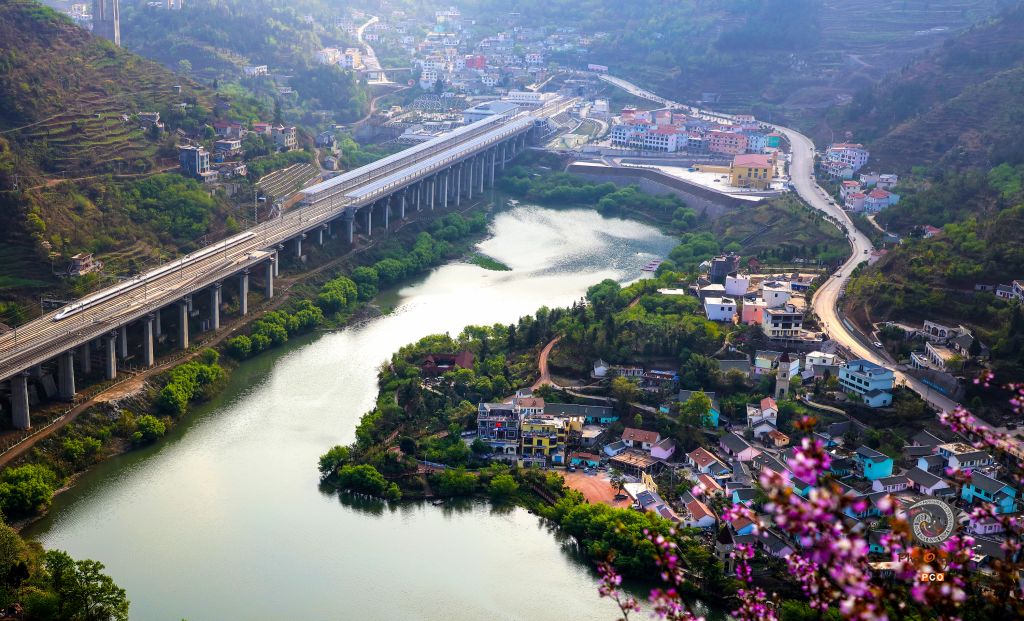 沪昆客运高速铁路普安县站是建在北盘江水系虎跳河上两个隧道间的桥梁上,站前的村寨为盘州市英武镇罗细,桥梁、河水村寨构成了一幅不可多得的美图。