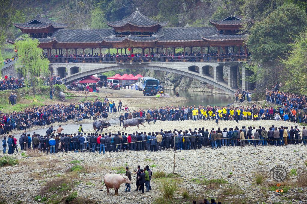 贵州省黔东南苗族侗族自治州雷山县郎德上寨风雨桥下斗牛正酣