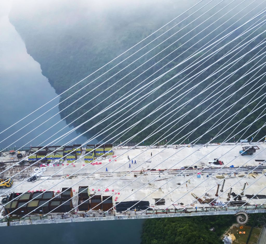 楠木渡大桥清晨忙碌的修桥人