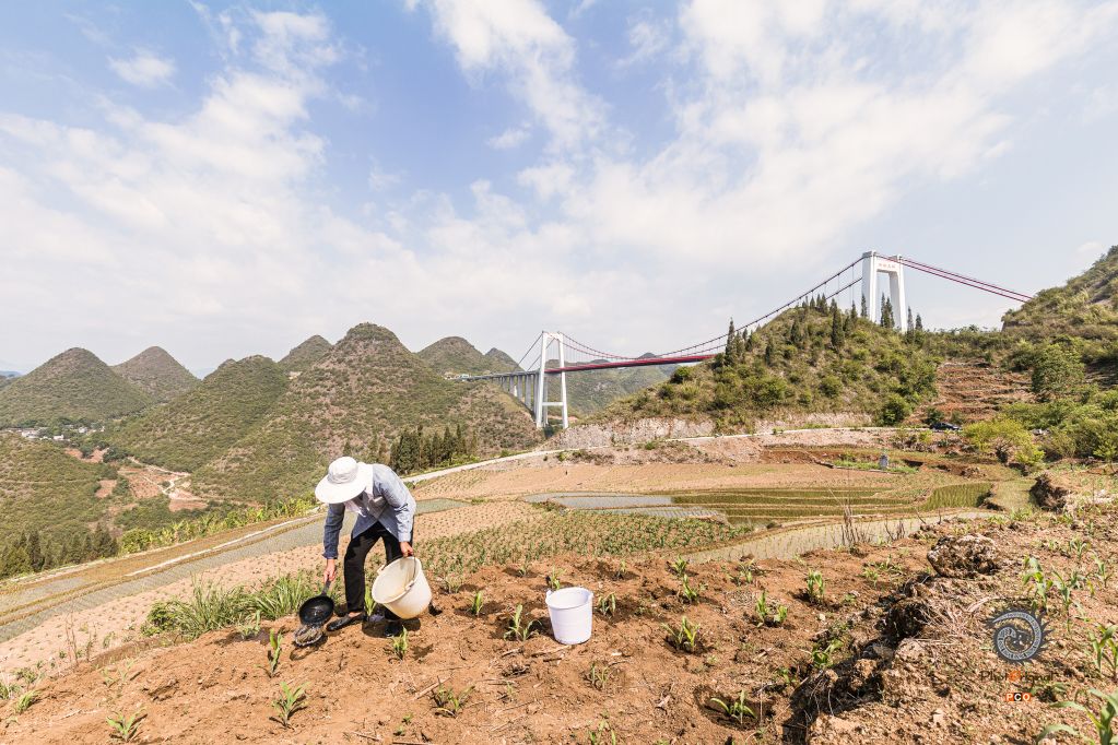 峰林特大桥边的村民正在给玉米地里的玉米浇水抗旱。2023年5月拍摄