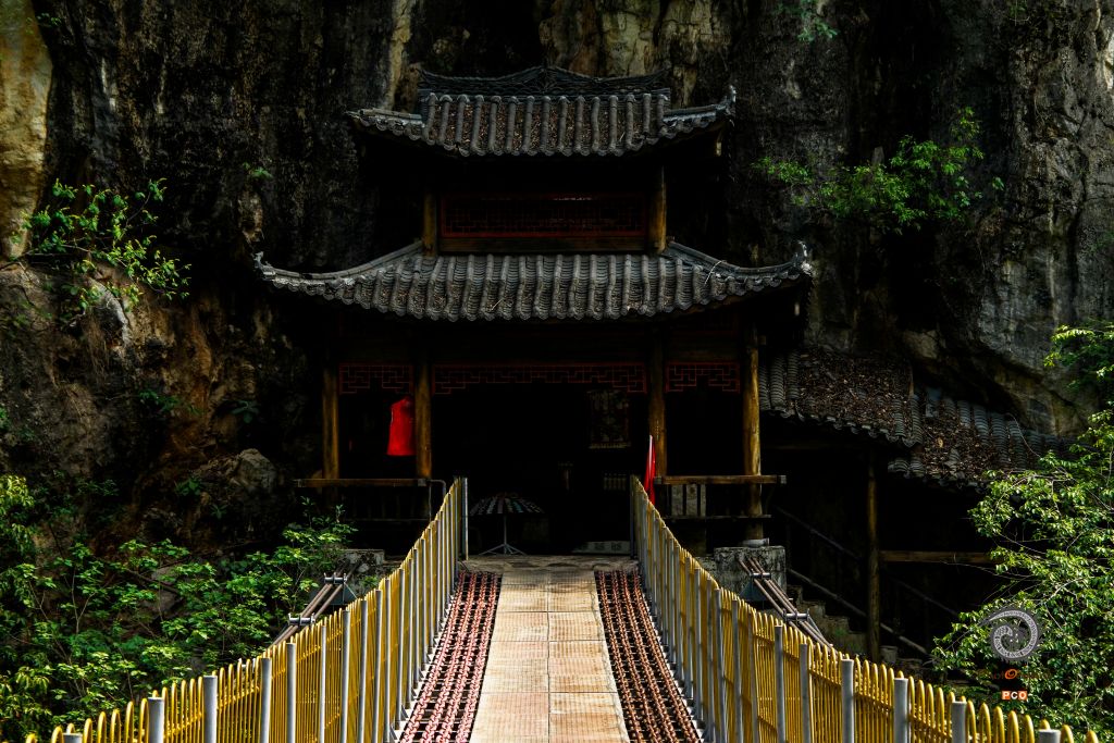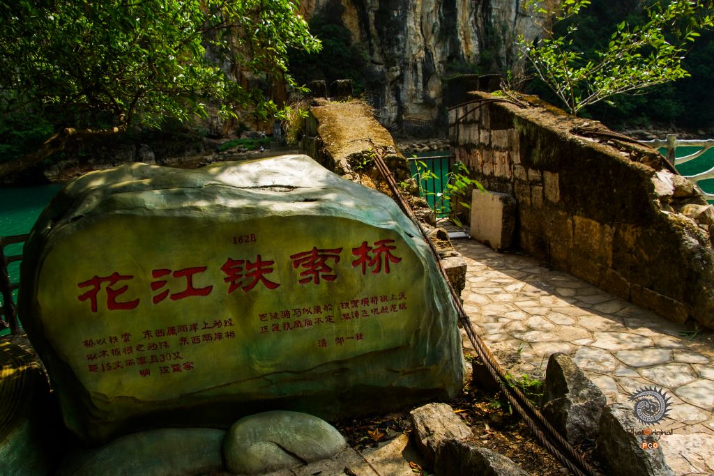 《花江铁索桥》位于关岭自治县花江镇五里村西南10公里处之花江河上。据记载,老桥是光绪二十四年(1898)贵州提督蒋宗汉筹款修建。解放前羊群压断,由旧关岭县政府修复。解放后1952年羊群又压断过半,1954年由省交通厅出资修复。1985年省财政厅拨款维修。桥架于两岸悬崖峭壁之间,用14根粗大铁链(每根262环)拴扣在两岸的石孔内,上铺木板数百块作桥面。两边扶栏亦用铁链扣于两岸。桥长71.5米,宽3米。由于董箐水电站的修建,造成水位上涨,铁索桥被水淹。为有效保护这一不可再生的文化资源,省文物局及相关部门通过多次论证,在其上游300米处复建铁索桥,设计采用现代工艺索桥结构,承载采用镀锌钢丝绳,原承载铁链作为文物置于桥面两侧,每侧各4根,桥长116米,桥面宽2.4米。新桥于2012年3月正式开工,2012年10月竣工。花江铁索桥架于峡谷两岸悬崖峭壁之间,横跨北盘江上,为古代进入黔西南、桂西北、滇东南的要津。这座桥既是连接贞丰和关岭的纽带,也是贵州和云南交通道路上的一把锁钥,一个咽喉,在历史上对促进内外民族文化和经济的发展发挥了重要的作用。