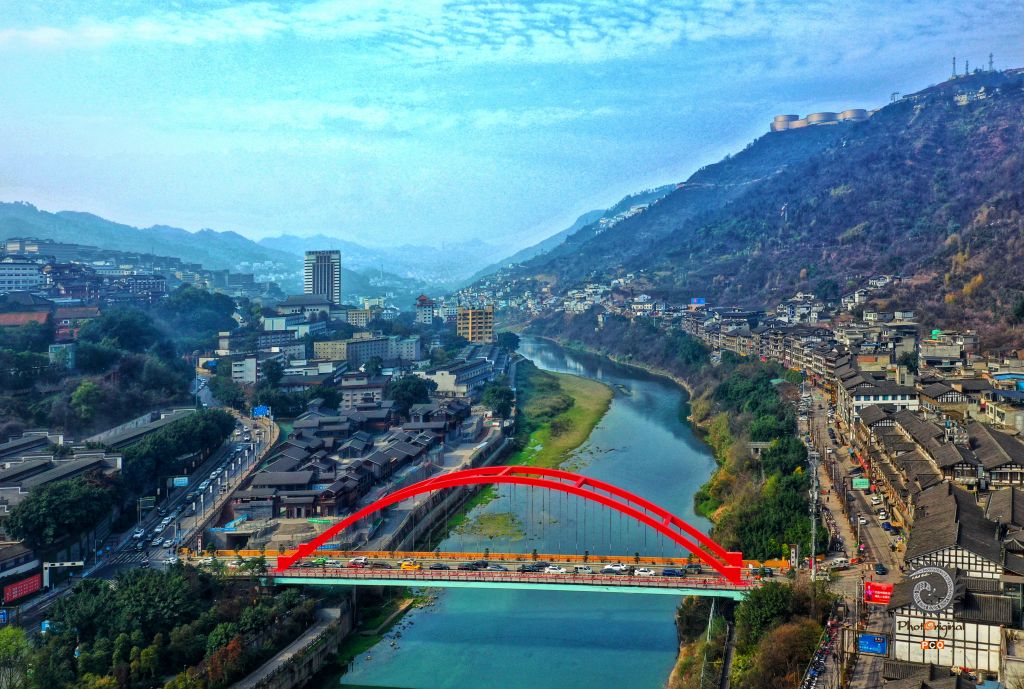 在贵州仁怀茅台镇旅游景区,远山如黛,赤水河上彩虹桥分外醒目鲜艳,在这国酒茅台的故乡,它见证经济发展和社会的变迁。