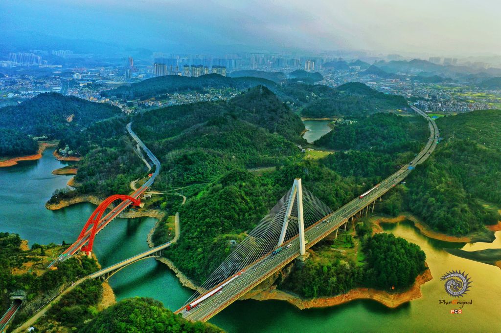晨光中山峦湖泊骏美,红枫湖上新老花鱼洞大桥以及跨径185米的红枫湖独塔斜拉桥,风格呈现各异,在不同的历史阶段都方便人们的出行,也见证着社会经济的发展变化。图片中,刚好拍摄到沪昆高速公路上,正在运输途中的风电叶片。