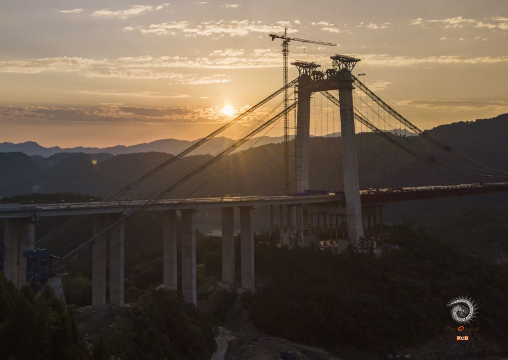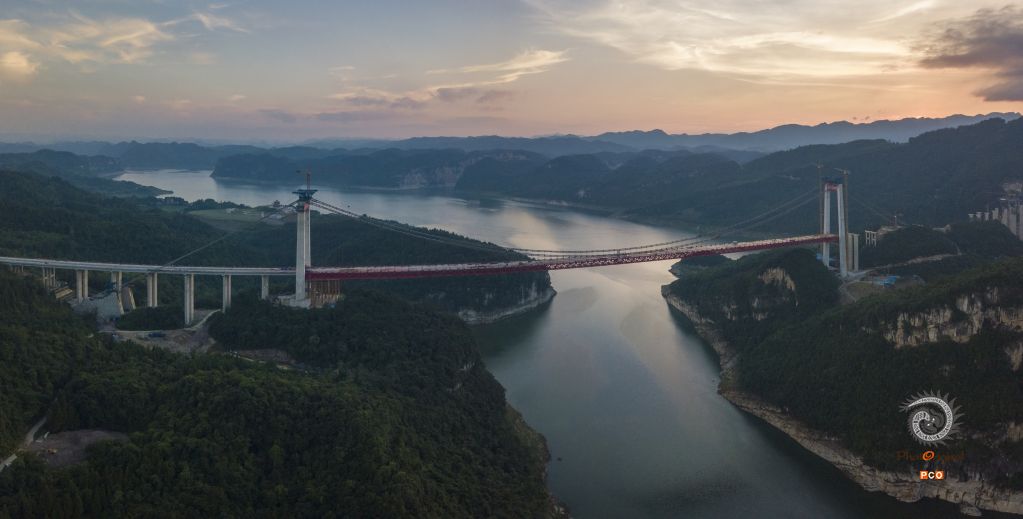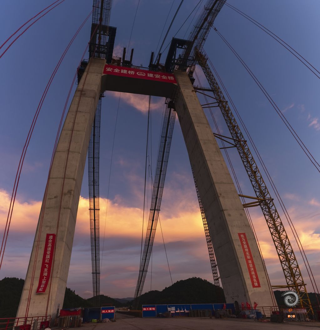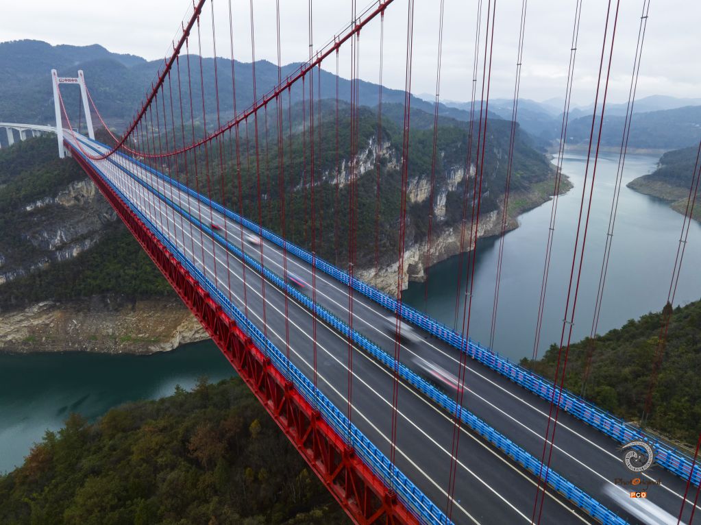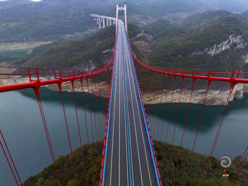 飞龙湖乌江大桥是遵余高速的控制性工程,全长1.24公里,为主跨为680米的钢桁梁悬索桥,主桥钢梁采用正交异性桥面板与钢桁梁拼装后整体吊装的施工工艺,系国内首例。 遵余高速是成渝经济区和黔北经济协作区南下珠江三角洲、北部湾经济区最便捷的一条高速运输大通道,起于余庆县境内江瓮高速余庆枢纽,线路由东向西途经余庆县、湄潭县、瓮安县,最后于遵义市播州区接入贵遵复线冷水坪枢纽。