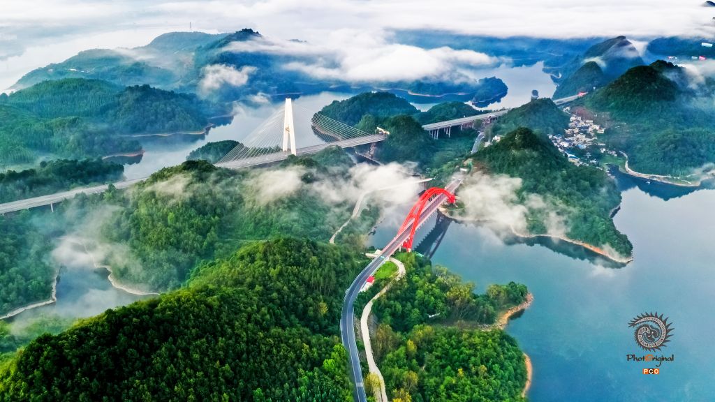 图片《青山绿水伴“三桥”》拍摄于2021年9月21日。红枫湖是贵州高原最大的喀斯特人工湖泊,是贵州高原地区乃至我国亚热带地区岩溶地质的人工库塘与天然河流结合的具有较高的代表性与典型性湿地。规划总面积为5580.43公顷,其中湿地面积4174.45公顷。在红枫湖的花渔洞地界上,分别建有三座大桥,其相距在百米开外,人称红枫湖上“三兄弟”。中间的叫老花渔洞大桥,建成于1981年8月,是红枫湖上的第一座大桥;第二座大桥于1986年8月15日动工,1991年同贵阳至黄果树贵州第一条高等级汽车专公路一同通车,人们称花渔洞大桥(或红枫湖上的“桥老二”);红枫湖上的第三座大桥于2002年2月正式动工兴建,2004年9月底正式竣工,同年与清黄高速公路一起开通,人们常称红枫湖大桥。红桐湖大桥是贵州第一座不对称独塔双索面预力混凝土斜拉桥,曾获得2006年度贵州省科技进步三等奖。花渔洞大桥由于年久已远,也无法满足社会和发展的需要,2018年贵州省委、省政府决定在花渔洞大桥的基础上,新建一座新的大桥,经两年多的建设,修建了现在的既实用又美观的彩虹桥。新建花渔洞大桥于2019年动工,2021年6月29日建成通车。