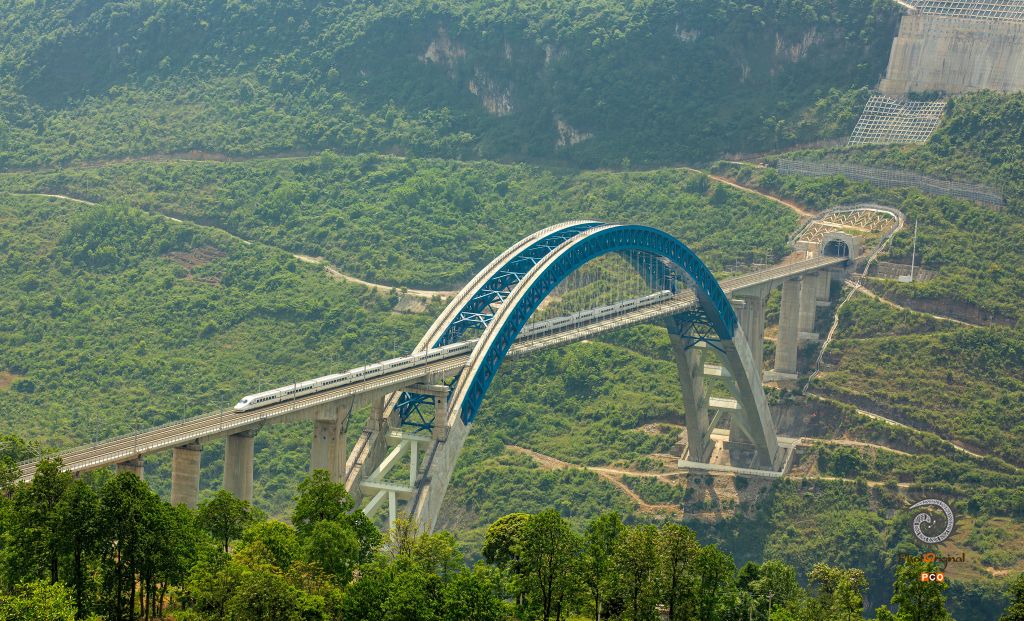 成贵高铁鸭池河特大桥全长971米、主跨436米,桥面至谷底深244米,位于黔西市铁石乡与清镇市暗流乡交界的鸭池河上,为世界上最大跨径中承式钢混结合提篮拱桥。本图片摄于2020年5月4日。