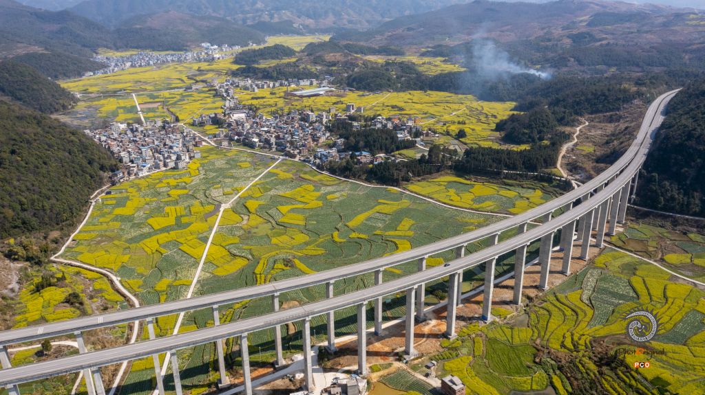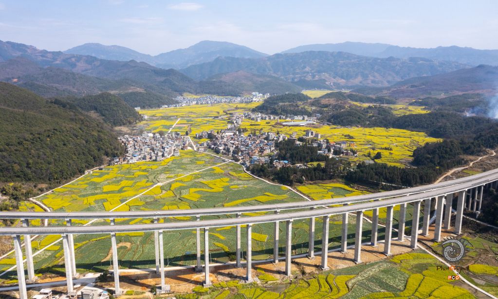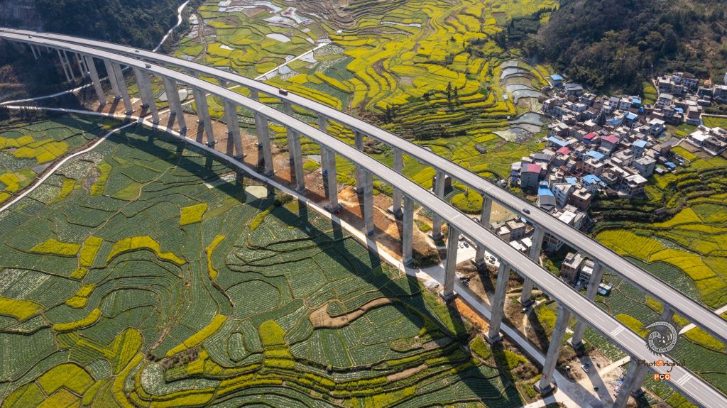 2022年3月9日,位于贵州省黔东南苗族侗族自治州从江县洛香镇上皮林村的高速公路高架桥与错落有致的民居、盛开的油菜花相映成景。