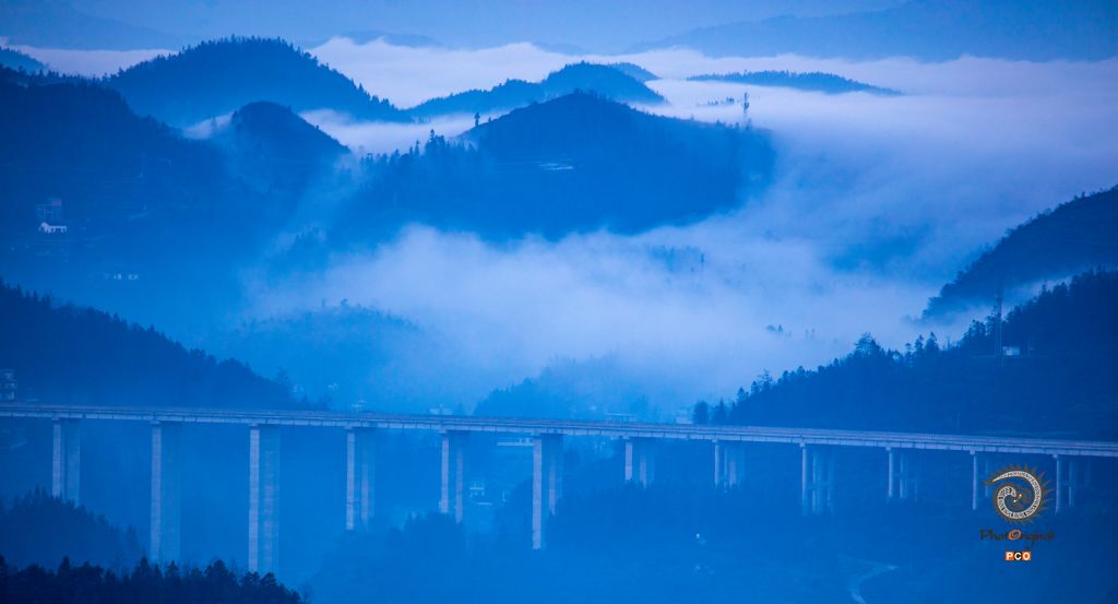 云雾中的贵州省盘州市内的盘兴高速上的桥,美如诗画般。