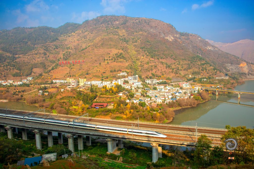 桥上动车出站