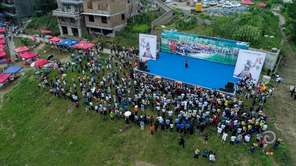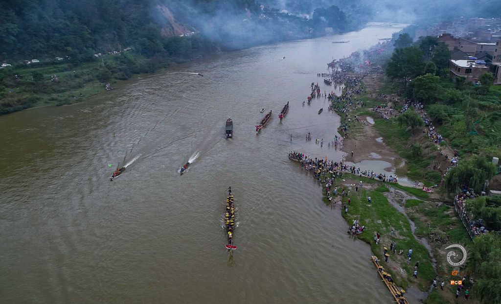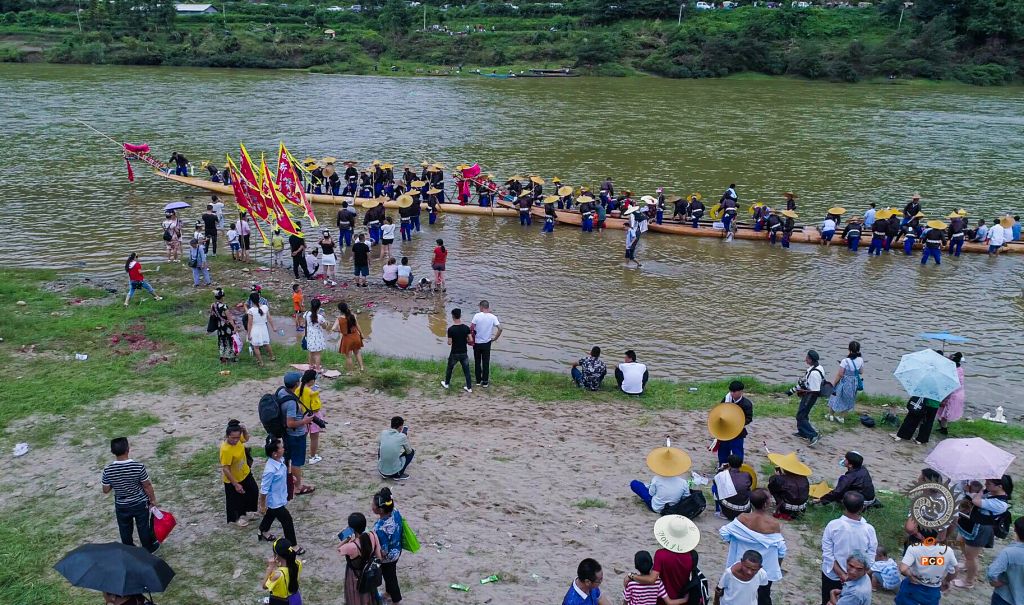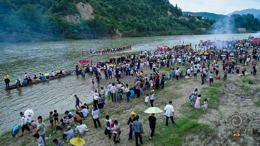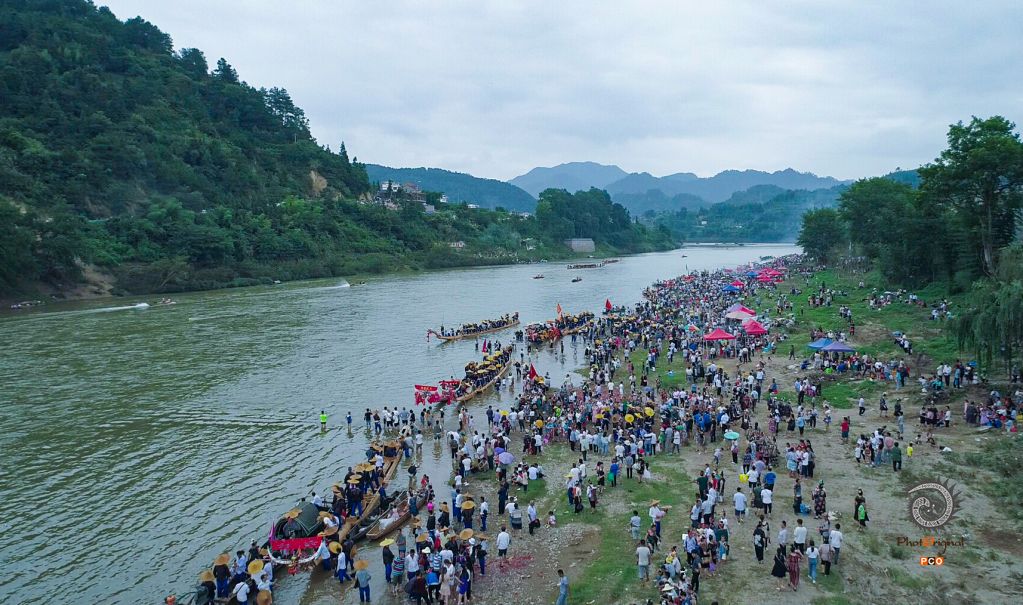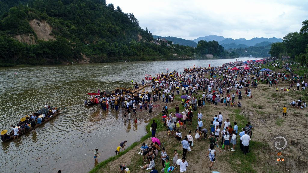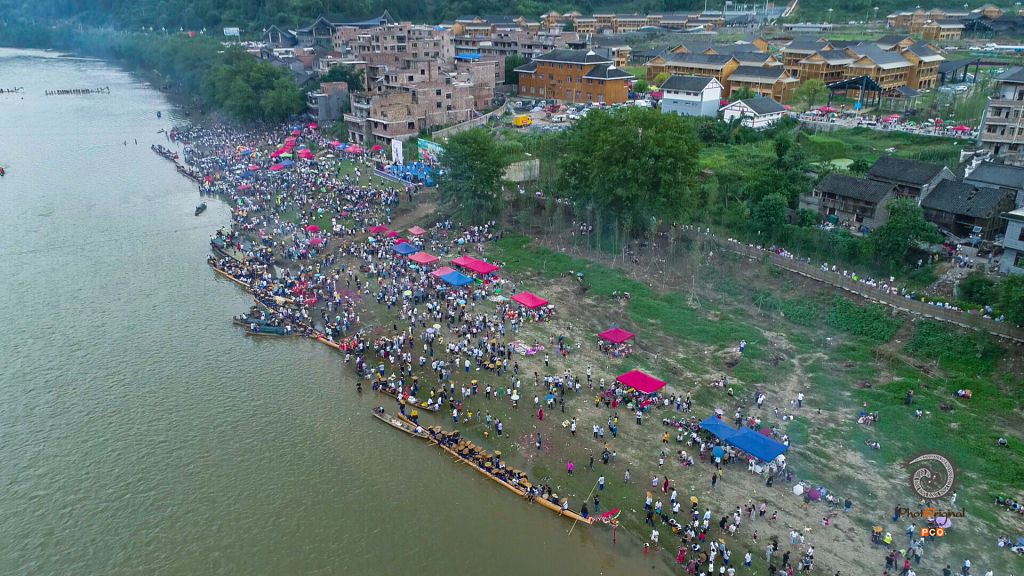 2018年多彩贵州,中国台江独木龙舟节现场,来自各地的少数民族侗胞参加这一盛大节日。人山人海、热闹非凡。
