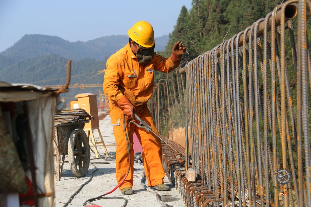 2021年12月21日在贵州省黔东南苗族侗族自治州榕江县塔石乡境内的雷榕高速施工现场,工人正在焊接钢筋