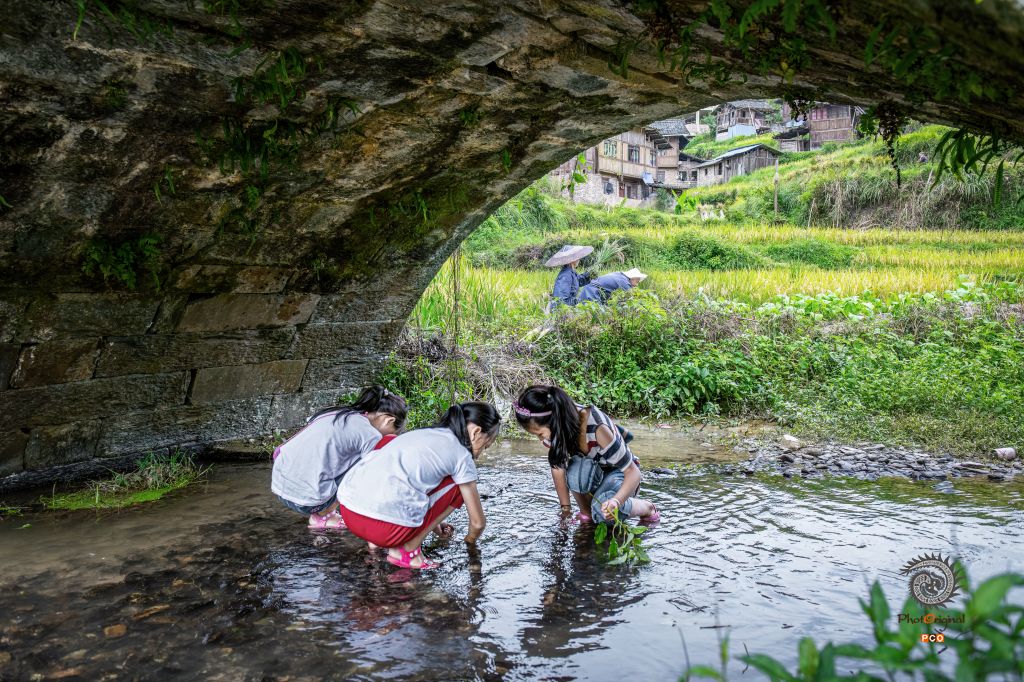 剑河县柳富村古石桥下,几名小女孩在捉小虾,桥的另一边俩位农民在收割稻谷。 作者:罗子钧 电话:13985291365