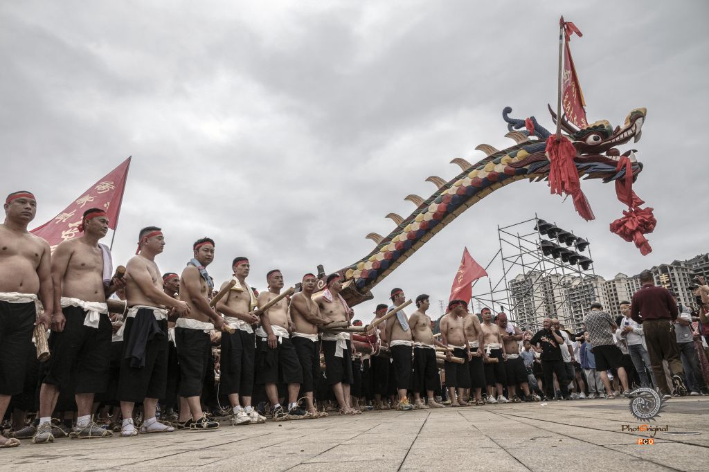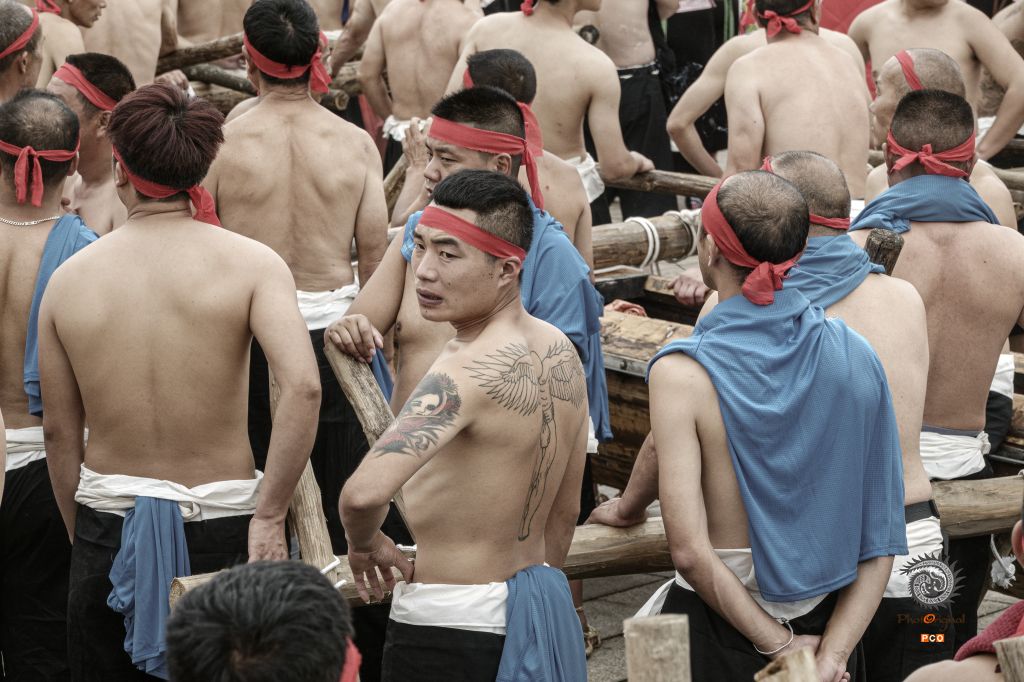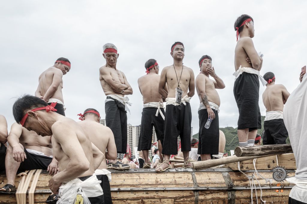 光着膀子抬龙舟