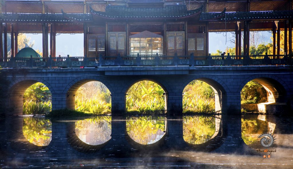 早晨的阳光穿过贵州省盘州市世界古银杏之乡石桥镇妥乐雨桥桥洞美若仙境。