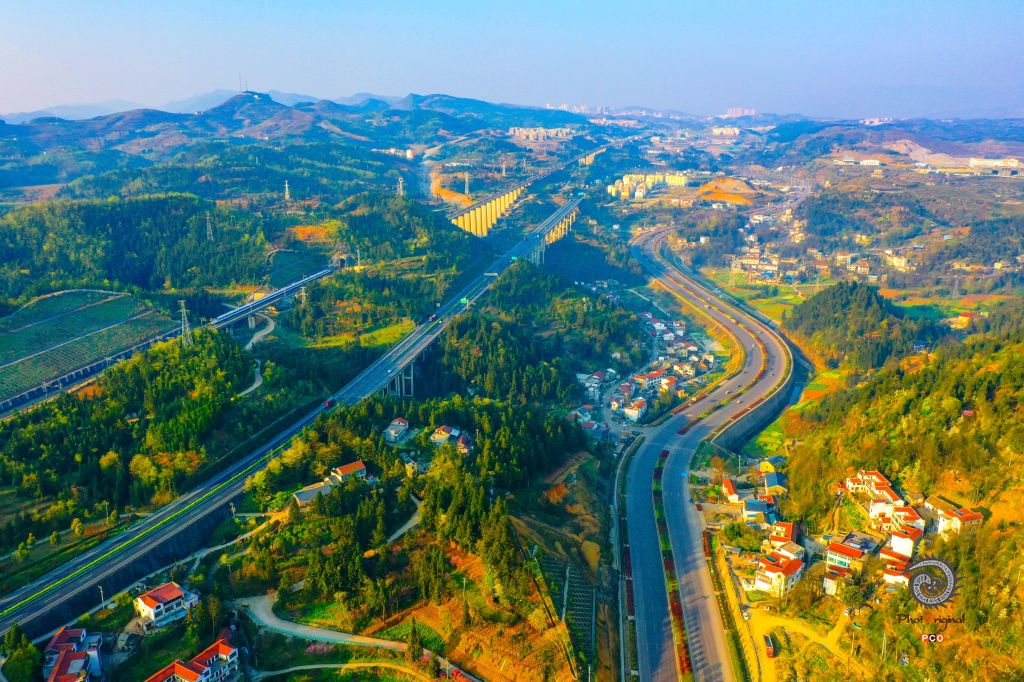 贵州省盘州市两街道办内的沪昆高速桥上飞奔的动车和汽车各自忙着。