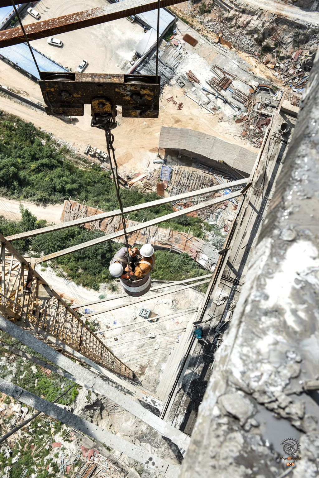 2016年9月30日,盘兴高铁下平川特大桥工地,两名工人借助废弃油桶下到人难以到达的地方施工。