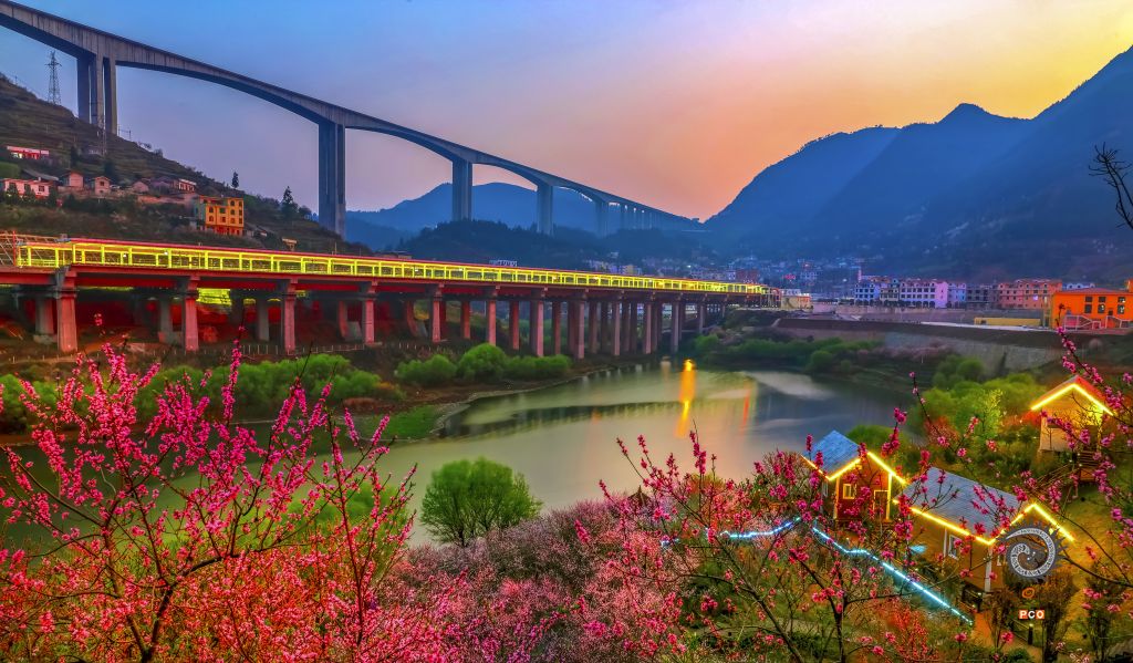 沪昆高速虎跳河大桥下的桥上高铁站夜色美不胜收。